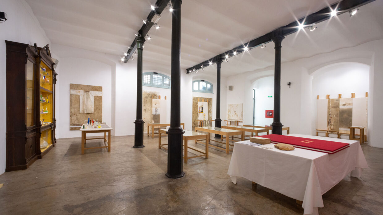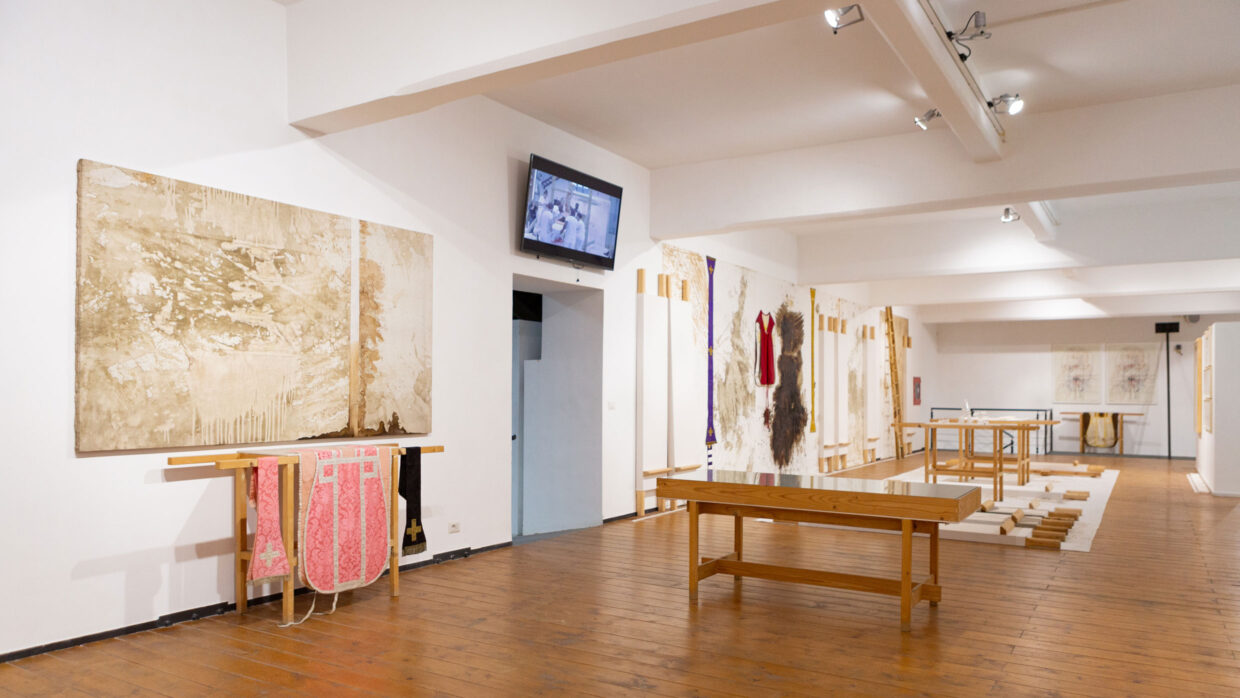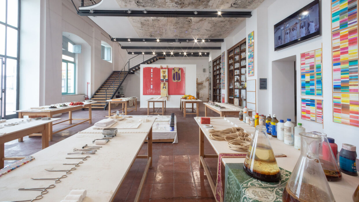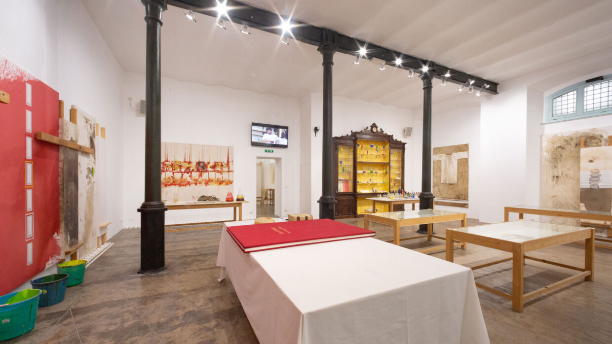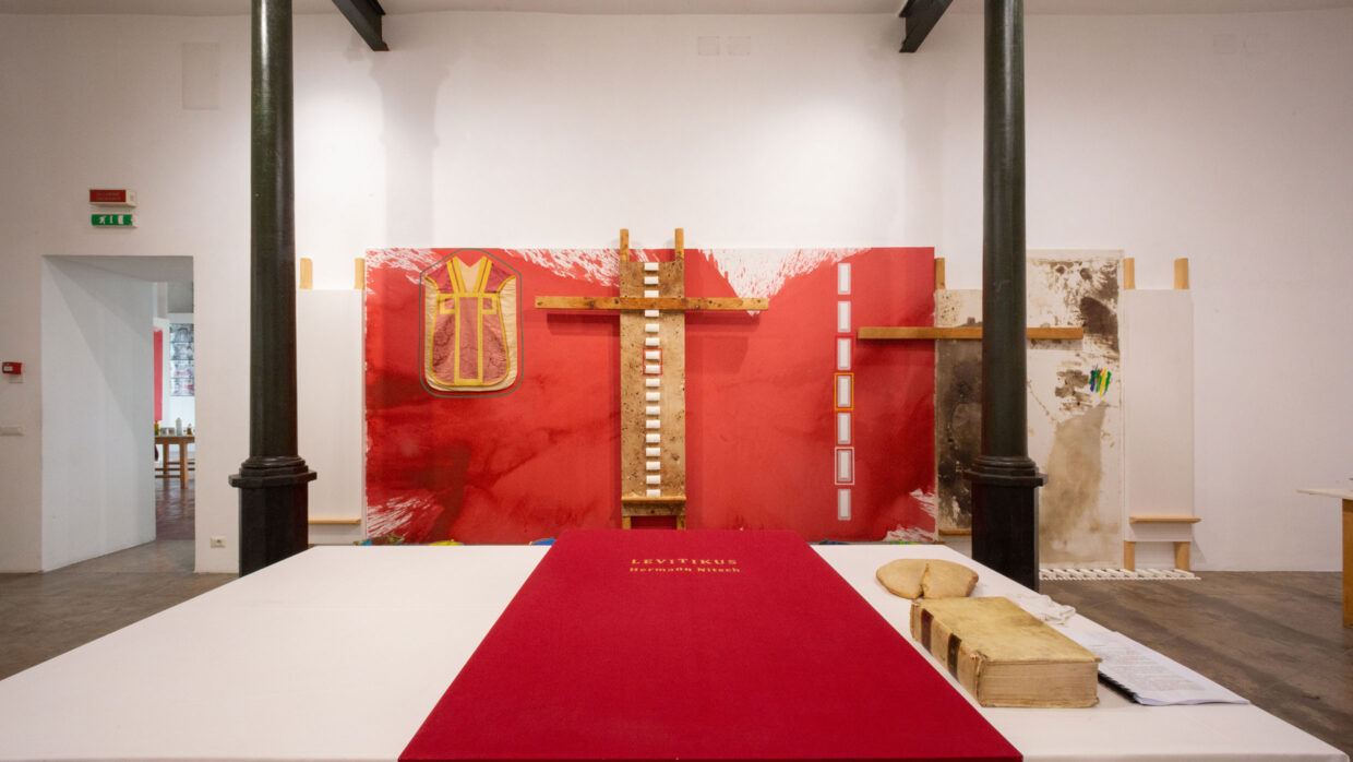 Die Ausstellung vereint erstmals einen zentralen Bestandteil der Museumssammlung in seiner vollen konzeptionellen und wahrnehmungsbezogenen Einheit. Dies geschieht durch eine neu konzipierte Installation, die als Labor der Sinne gestaltet ist: eine immersive und prozessorientierte Umgebung, in der das Kunstwerk nicht als fertiges Objekt, sondern als aktives Instrument präsentiert wird, das die Besucher in ein umfassendes ästhetisches Erlebnis einbindet. Im Sinne des Gesamtkunstwerks wird das Museum zu einem lebendigen Organismus, in dem Malerei, Aktionsobjekte, Klang, Raum, Zeit und Körperlichkeit zusammenfließen, um eine intensivere Wahrnehmung der Realität zu erzeugen und Hermann Nitschs Vision des Kunstwerks als radikale Erweiterung des Lebens zu bekräftigen.