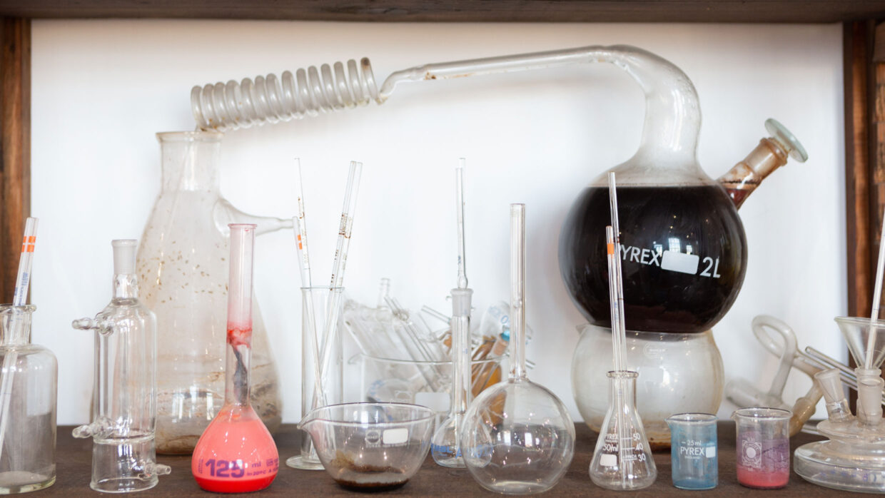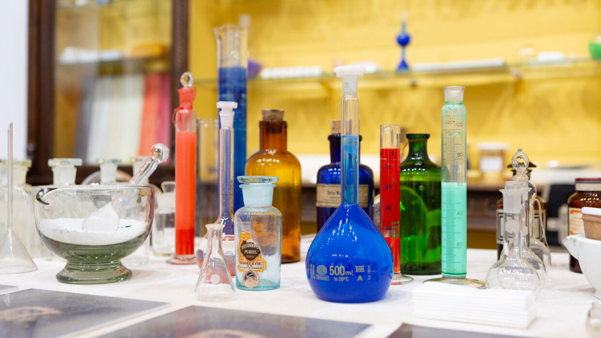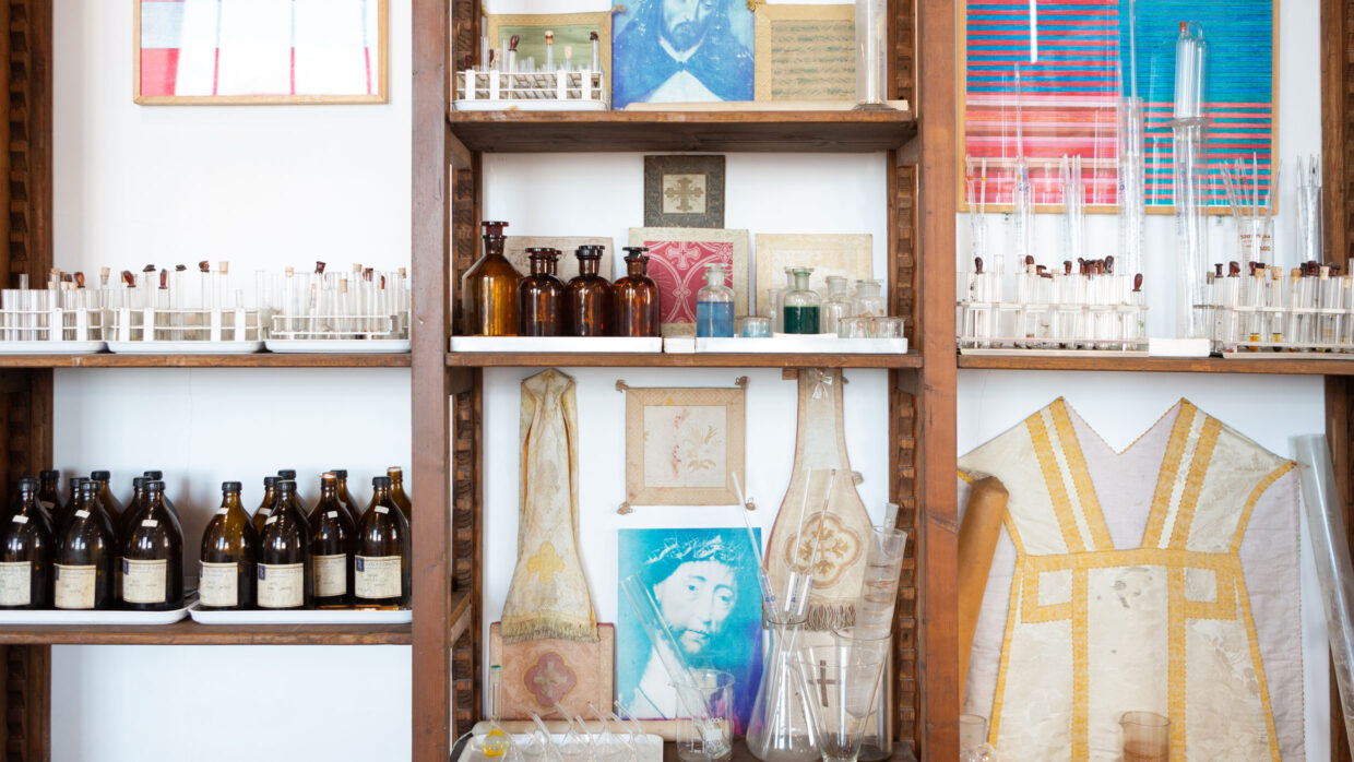 Im Zentrum der Ausstellung stehen drei großformatige Schüttbilder, die bei der 152. Aktion (Neapel 2017) entstanden sind – eine der radikalsten Aktionen des Künstlers. Diese Werke werden im Dialog mit fotografischen und videografischen Dokumentationen der Aktion sowie einer Auswahl an Instrumenten aus Nitschs malerischer und performativer Praxis präsentiert. Ebenfalls Teil der Ausstellung ist ein bedeutender Teil des von der Familie Scotto di Vettimo gestifteten chemischen und pharmazeutischen Labors, bestehend aus Flaschen, Kolben, Destillierkolben und Behältern, die die alchemistische und experimentelle Dimension von Nitschs Werk verdeutlichen.