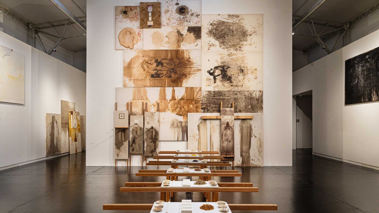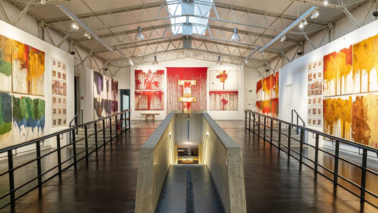 Die Ausstellung „Hermann Nitsch. von sonnenaufgang an“ widmet sich dieser sinnlichen Dimension seines Werks. Malereien in liturgischen Farben, Landschaftsaufnahmen, Videos und klangliche Elemente verdichten sich zu einem atmosphärischen Erfahrungsraum. Die Natur – das Weinviertel, das Licht, die Elemente – wird dabei zum zentralen Schauplatz: Im 6-Tage-Spiel, dem um fassendsten Projekt des O.M. Theaters, beginnt jede Phase „von sonnenaufgang an“. Es ist die Natur selbst, die den Rhythmus dieses Werks bestimmt.